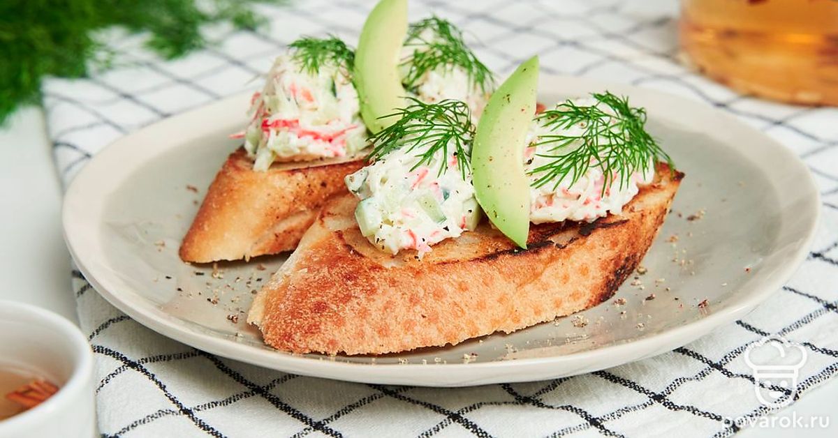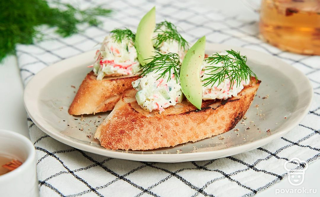 Бутерброды из крабовых палочек на кусочках багета — простая, но изящная и вкусная закуска — подойдут для фуршета или праздничного стола. Свежесть багета определит все вкусовые качества этого хлеба, а хранится он не более суток. Так как крабовые палочки не проходят термическую обработку, выбирая их, остановитесь на действительно качественном продукте. Идеальный состав — сурими с добавлением яичного белка и умеренного количества крахмала.