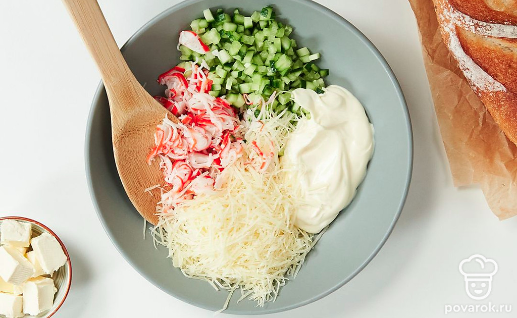 Приготовьте начинку. Огурцы смешайте в миске с крабовыми палочками, добавьте тертый сыр. Посолите и добавьте 3 ст. л. майонеза. Перемешайте начинку.