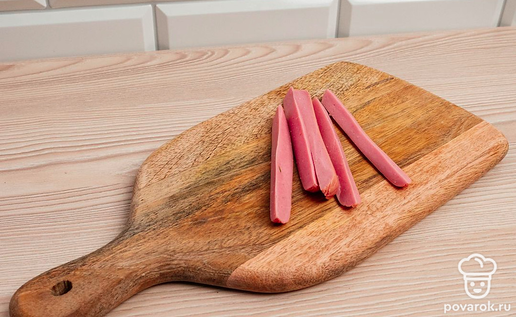 Сосиски порежьте на четыре части, так чтобы получились длинные полоски.