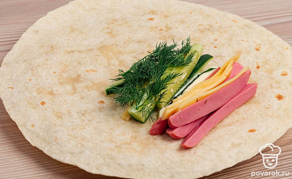 Ближе к середине (как показано на фото) смажьте лаваш майонезом. Сверху положите огурцы, сосиски, сыр и укроп.