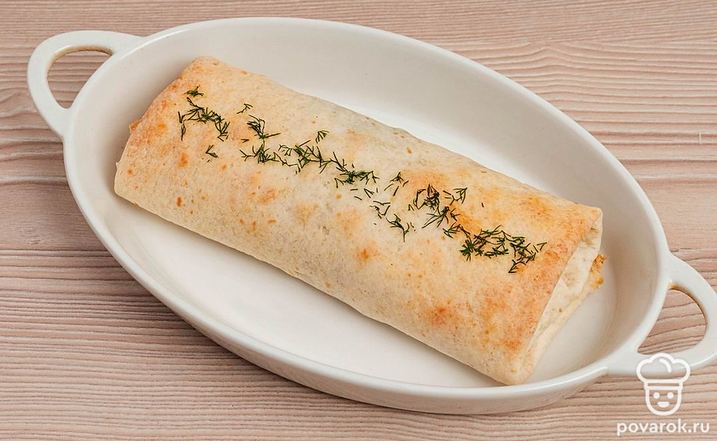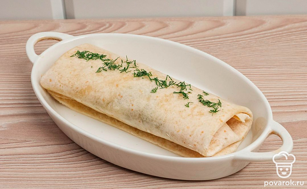 Форму для запекания смажьте маслом и переложите приготовленный лаваш в форму. Укроп мелко порежьте и сформируйте из него небольшую полоску вдоль лаваша.