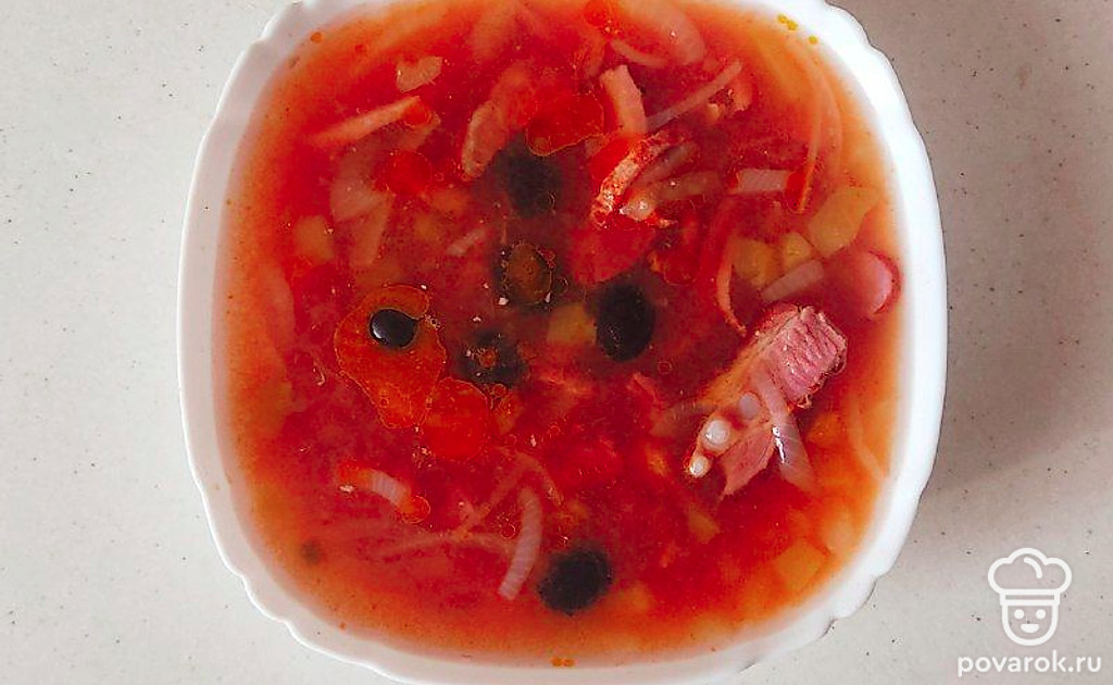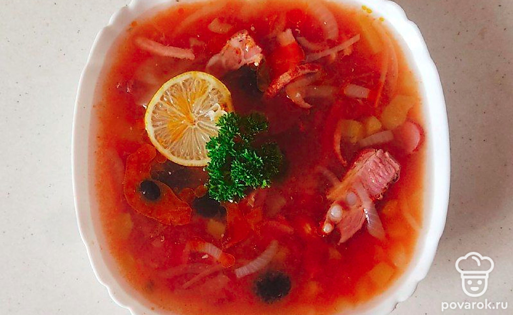 Наваристая, острая, пикантная солянка дошла к нам из глубин веков, когда на Руси солянкой стали называть густой наваристый суп, который в основном готовили на рыбном бульоне. Со временем многое в рецепте изменилось, но основой остается все такой же крепкий бульон. В данном варианте в нем использованы копчености, и именно это придает солянке ее эффектность. Кулинарам это блюдо дает возможность реализовать на кухне разные вариации задуманного.