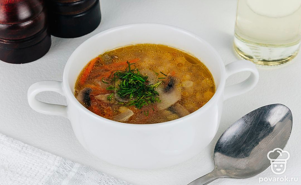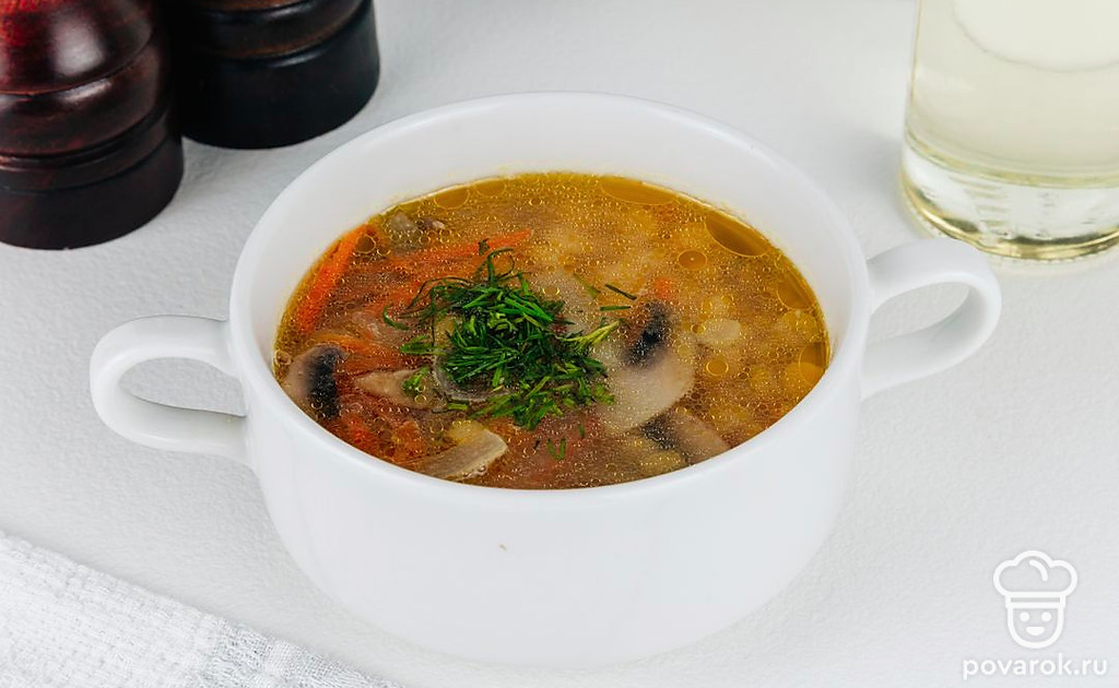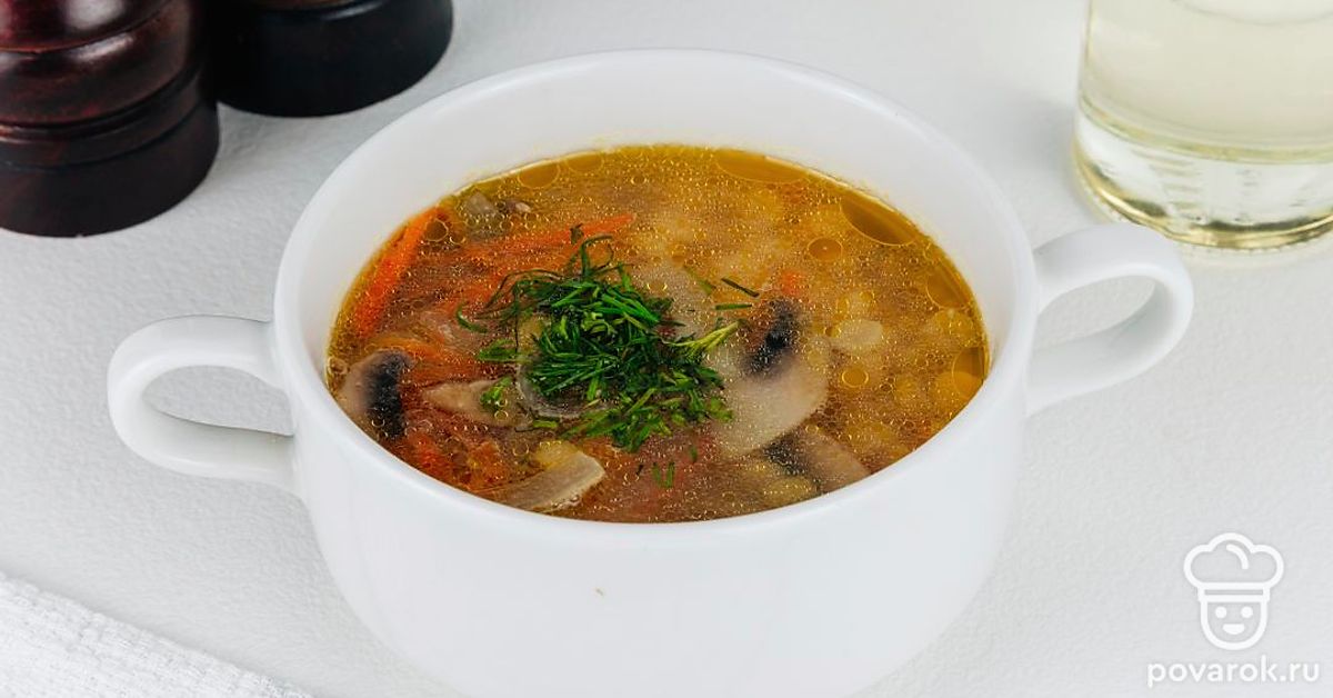 Гороховый суп — популярное первое блюдо во многих европейских странах, в том числе и в России. Чаще всего основу супа составляет сушеный цельный или колотый горох. Главным нюансом приготовления супа является предварительное замачивание гороха в холодной воде. Лучше всего это сделать на ночь. Горох вберет в себя необходимое количество жидкости и будет намного быстрее вариться. В этом рецепте предлагаем вам приготовить легкий вегетарианский гороховый суп с шампиньонами.