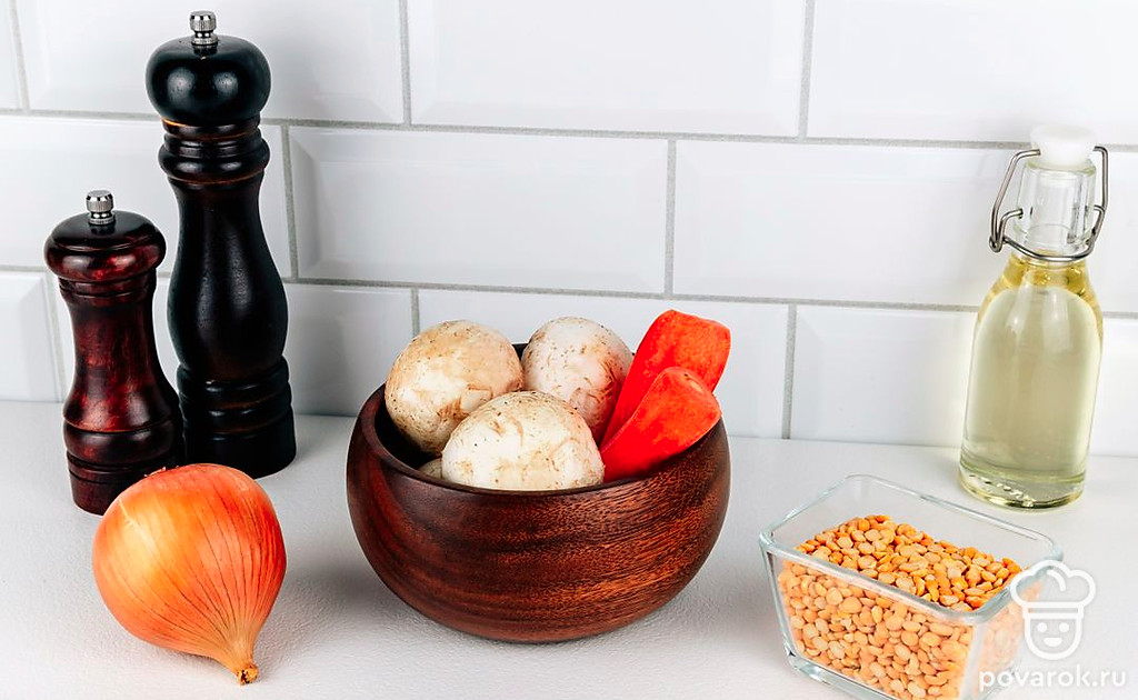 Горох промойте, залейте большим количеством холодной воды и оставьте на 3 часа, а лучше на ночь. Очистите репчатый лук и морковь. Шампиньоны помойте.