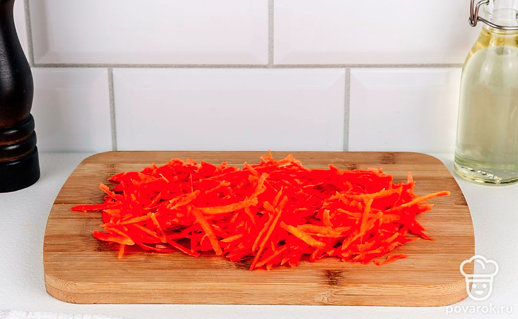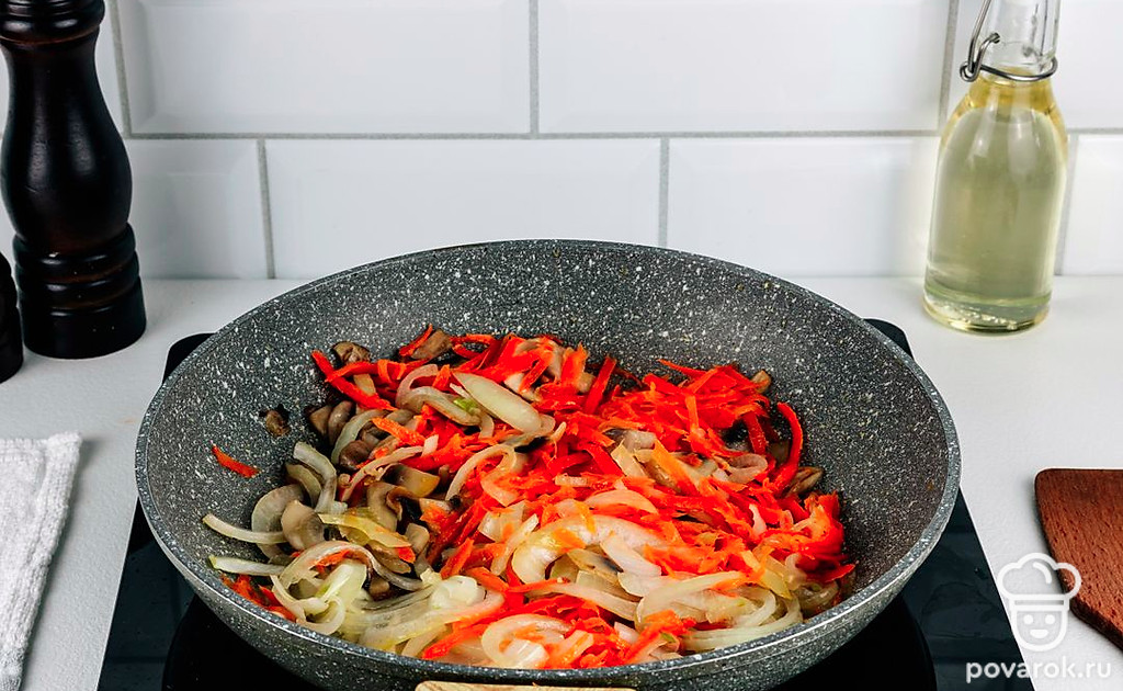 Тем временем разогрейте сковороду и влейте растительное масло. Выложите в сковороду репчатый лук и обжарьте его до золотистого цвета 5 минут. Затем добавьте морковь и шампиньоны. Пассеруйте овощи и грибы на небольшом огне 10 минут.