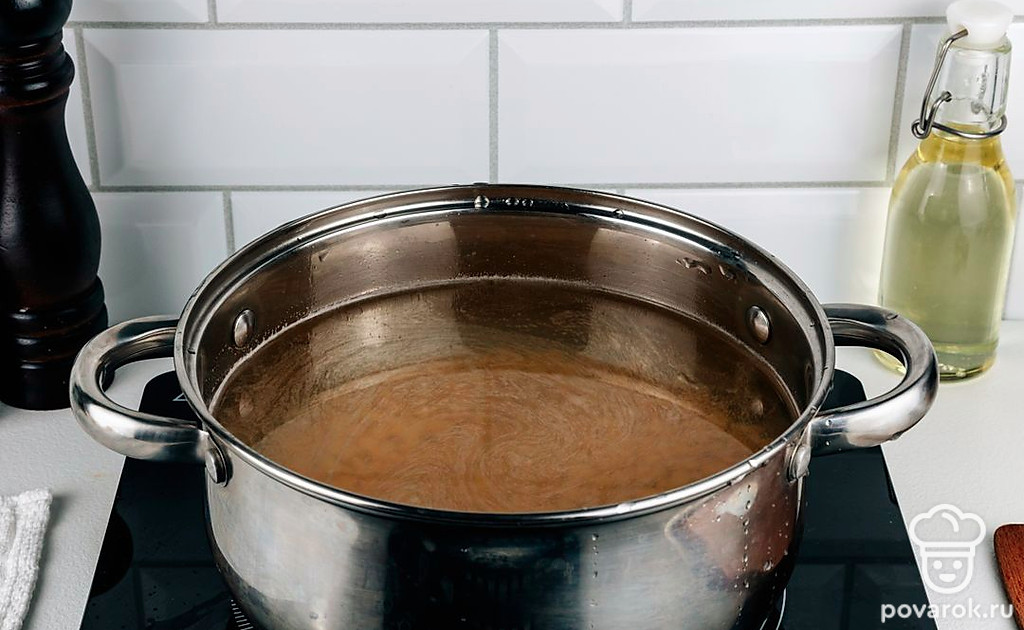 Залейте горох водой и поставьте на огонь. Когда вода закипит, убавьте огонь. Варите горох, периодически снимая пену.