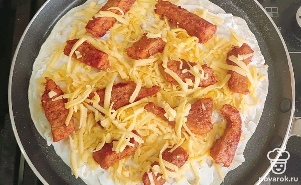Готовую тортилью смажьте сливочным сыром, посыпьте тертым твердым сырым. Сверху него положите мясо, на него – снова твердый сыр. Тортилью с начинкой положите на разогретую сухую сковороду и накройте другой лепешкой. Жарьте по 1 минуте с обеих сторон.