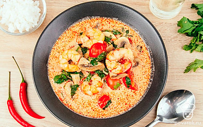 Том Ям — это традиционный суп тайской кухни. Как правило его готовят на основе куриного бульона, рыбы и морепродуктов с добавлением грибов, помидоров черри и риса. Еще неотъемлемым ингредиентом том-яма является кокосовое молоко. Поскольку существует много вариаций этого блюда, то иногда кокосовое молоко заменяют сливками или не добавляют вовсе. Неповторимый вкус и аромат супу придают азиатские пряности: листья лайма, острый перец, паста кимчи, имбирь, лемонграсс, а также свежий лайм и лимон.