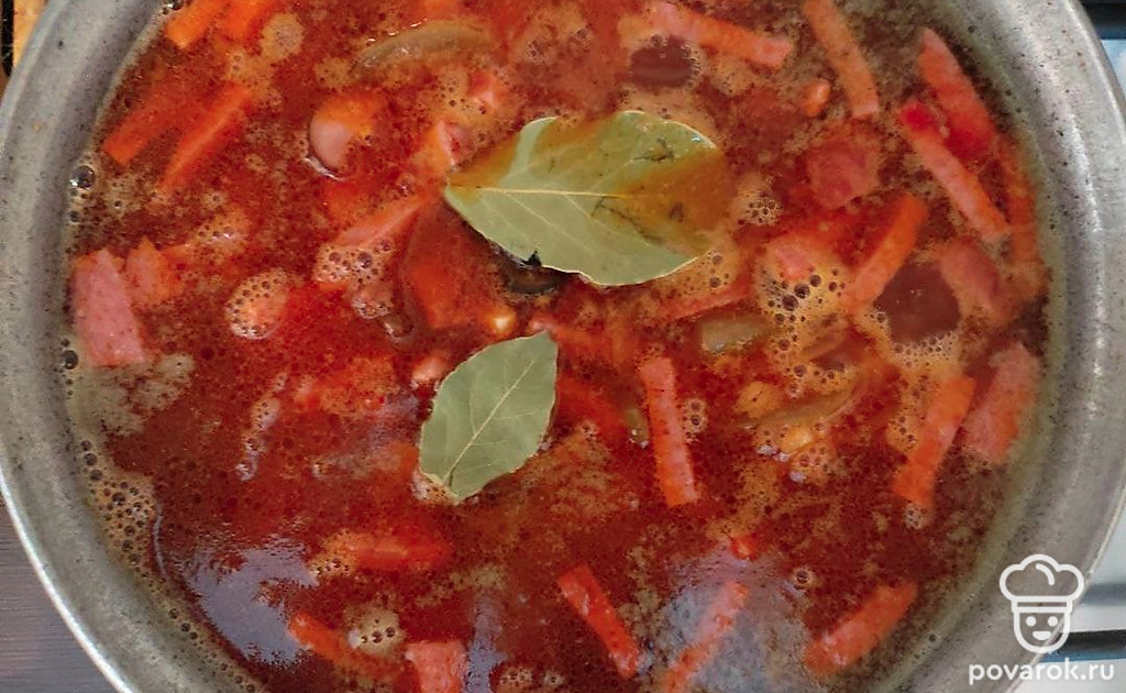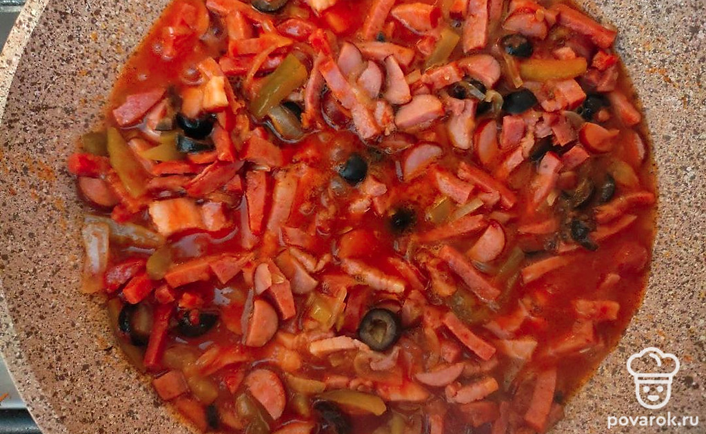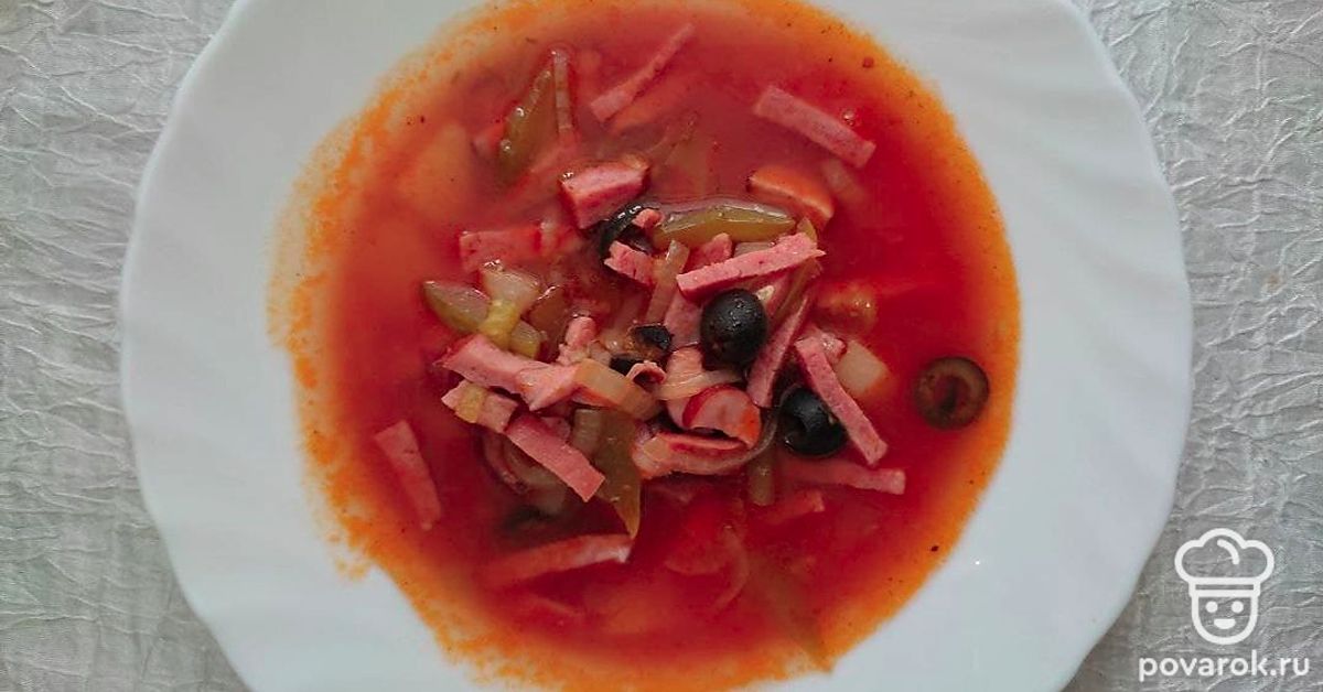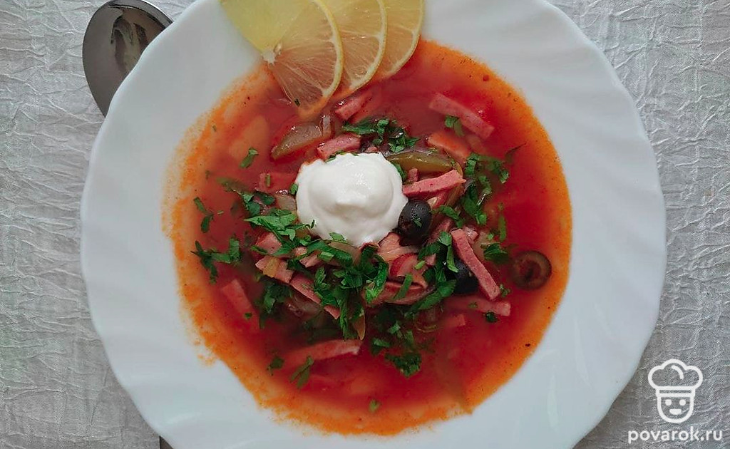 Солянка сборная с копчеными колбасками получается невероятно ароматной, сытной, с насыщенным вкусом и пикантной кислинкой. Копчености придают супу невероятный аромат, а маслины и долька лимона добавляют яркий вкус и внешний вид. Солянка — калорийное блюдо, идеально подходящее для холодного времени года. Такой суп бодрит своим насыщенным вкусом и ярким цветом. Солянка сборная станет хорошим выбором для обеда как в кругу семьи, так и в большой компании гостей.