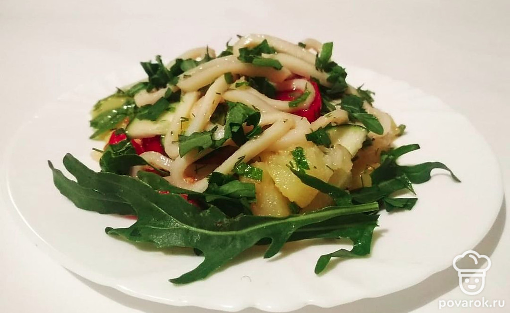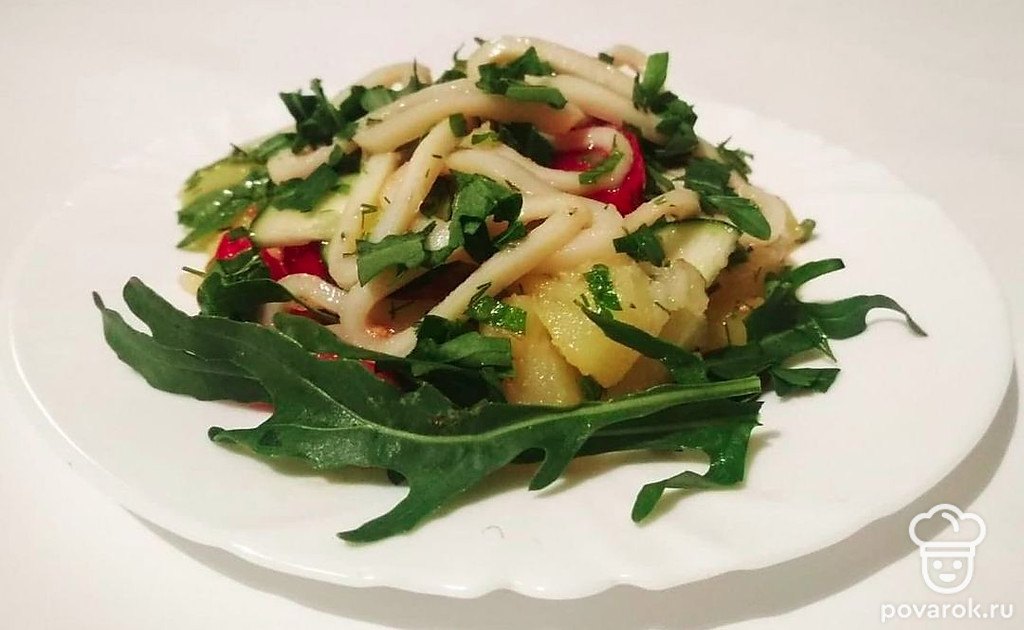 Кольца кальмара смешайте с нарезанными овощами, посолите, поперчите, заправьте лимонным соком и оливковым маслом. Сверху посыпьте руколой и другой зеленью.