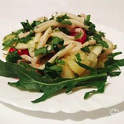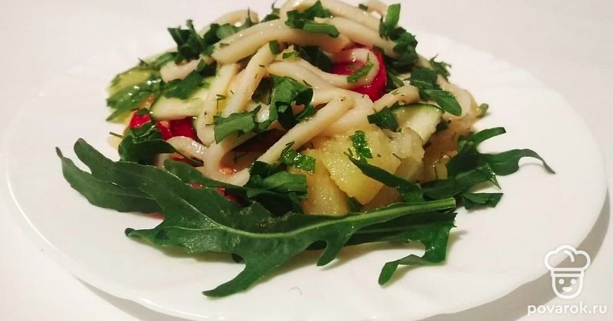 Если говорить о кладезе витаминов и полезных веществ, то несомненно это о руколе. Эта горчичная трава поддерживает иммунитет, укрепляет стенки желудка и повышает уровень гемоглобина. А когда она в сочетании с кальмаром — это высокая концентрация белка. Помимо всех полезных свойств данного блюда, оно еще и безумно вкусное.
