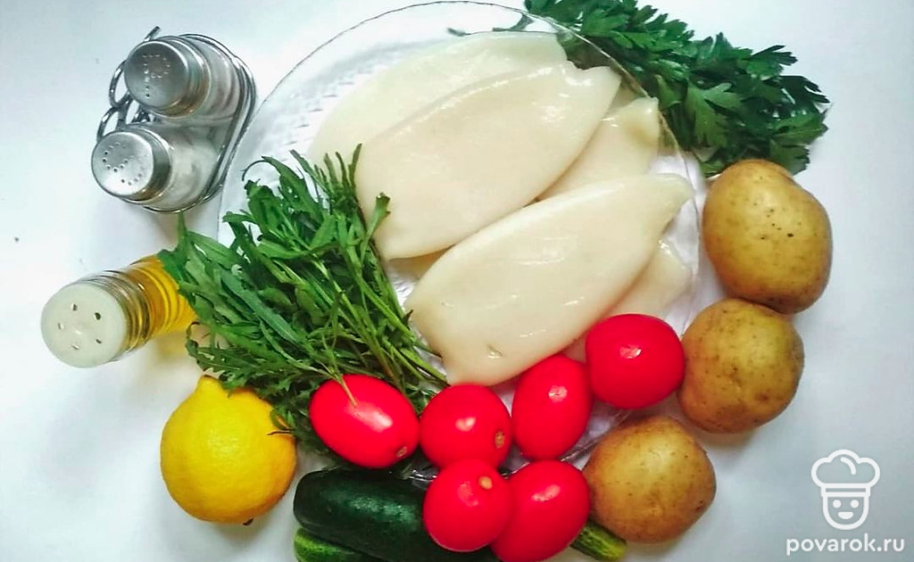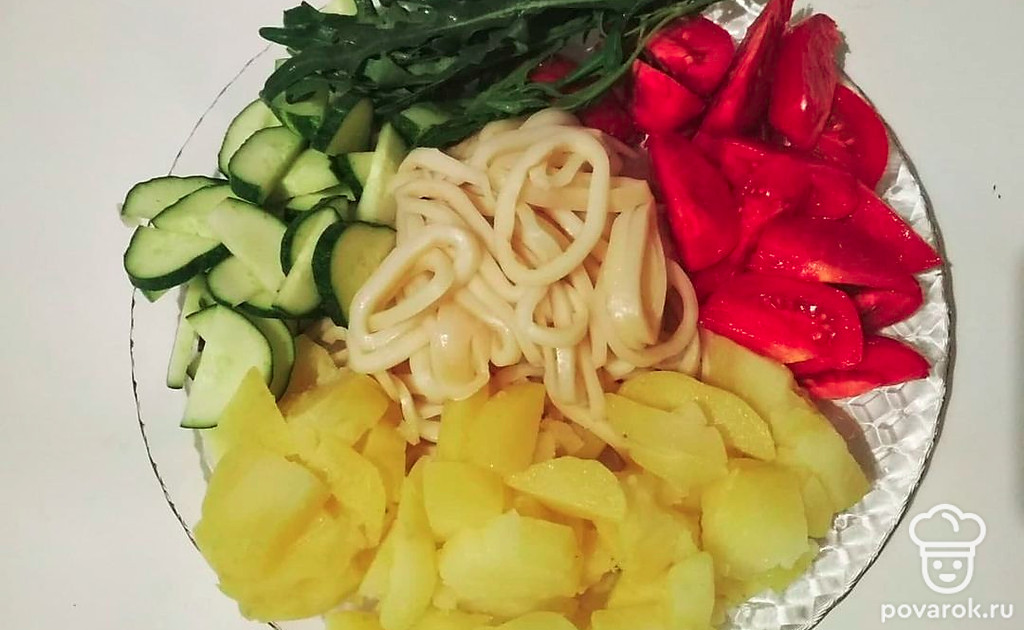 Отварите картофель. Кальмары отварите в течение 2-х минут, почистите, нарежьте кольцами.