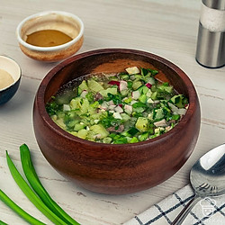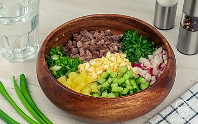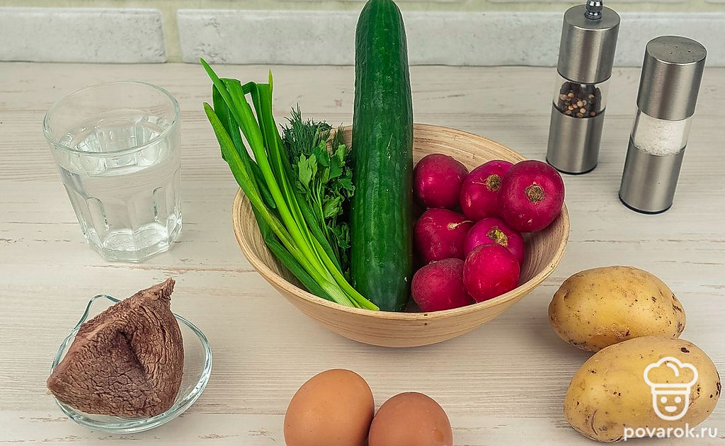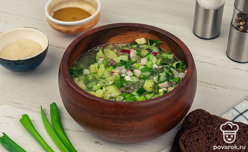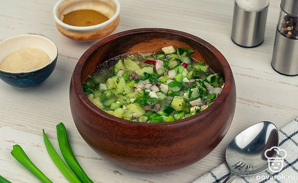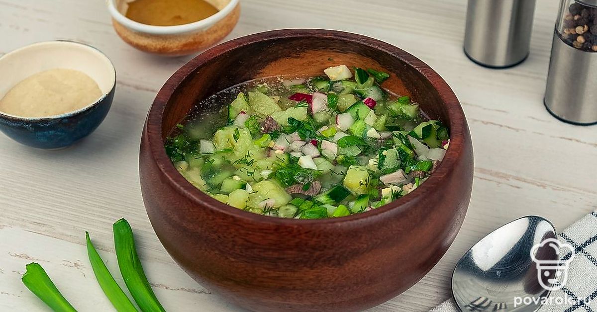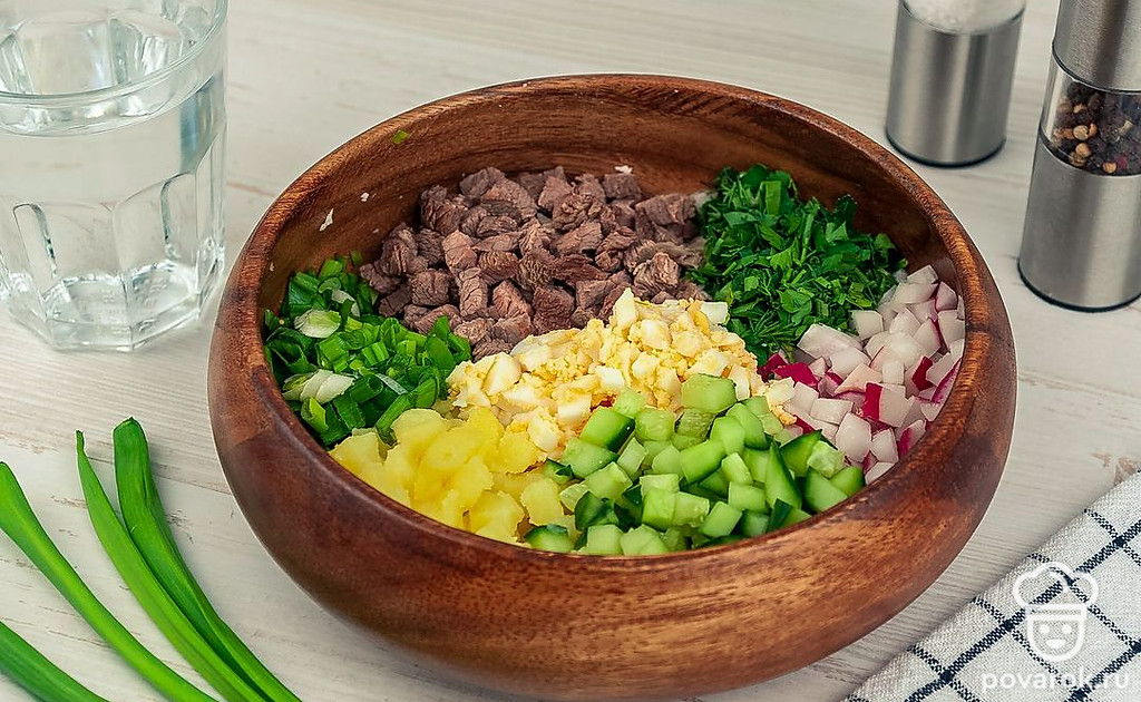 В жаркую погоду охлаждающая окрошка на минеральной воде — просто спасение, особенно когда совсем не хочется готовить и тем более есть горячую пищу. Минеральная вода, овощи и натуральная сезонная зелень сделают это блюдо полезным, а кусочки вареной говядины — насыщающим и диетическим.