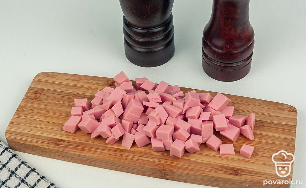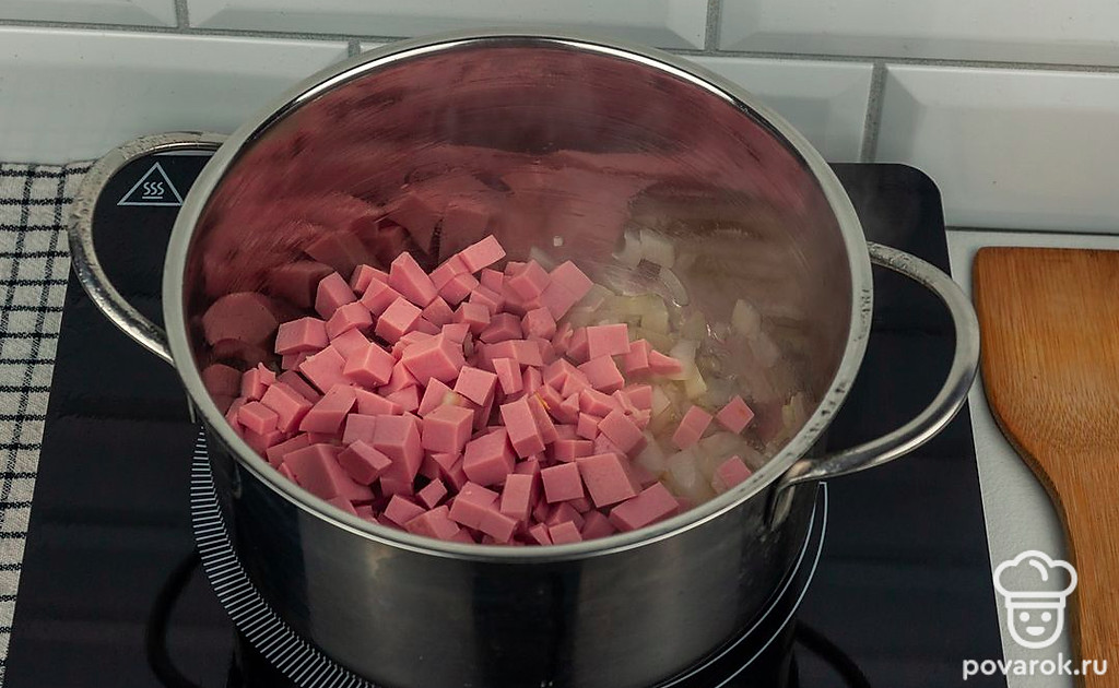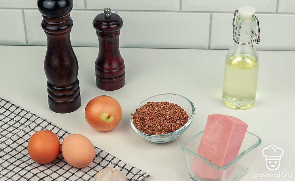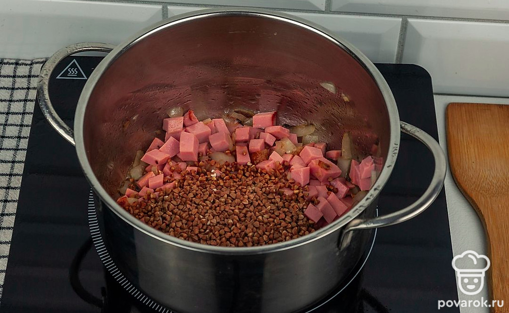 Гречневую крупу промойте и добавьте к вареной колбасе и луку.