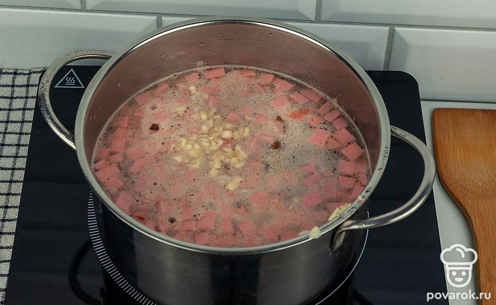 Добавьте в суп чеснок, соль и перец по вкусу и оставьте вариться на медленном огне еще на 5 минут.