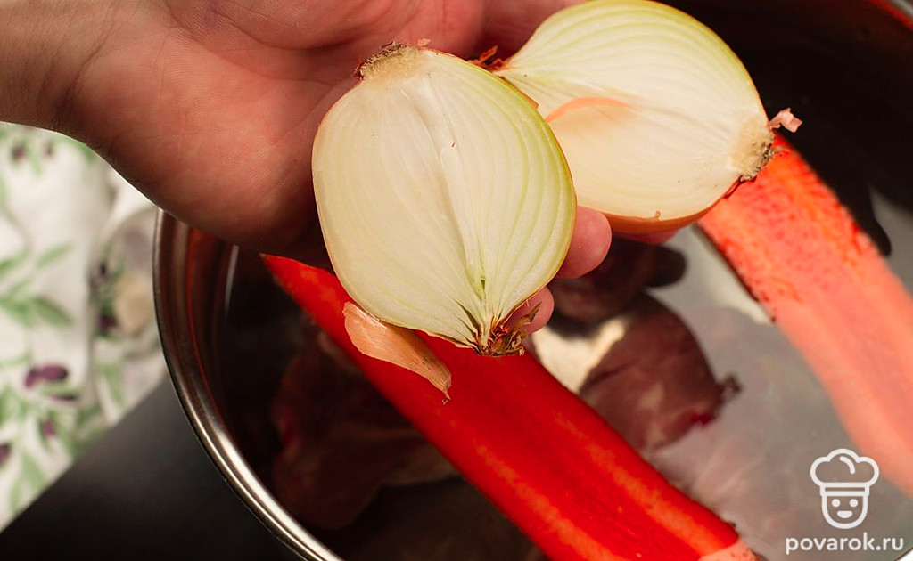 Возьмите кастрюлю и наполните водой. Выложите в нее мясо. Разрежьте луковицу и морковь на две части и отправьте к мясу. Поставьте на огонь и варите 2 часа после закипания.