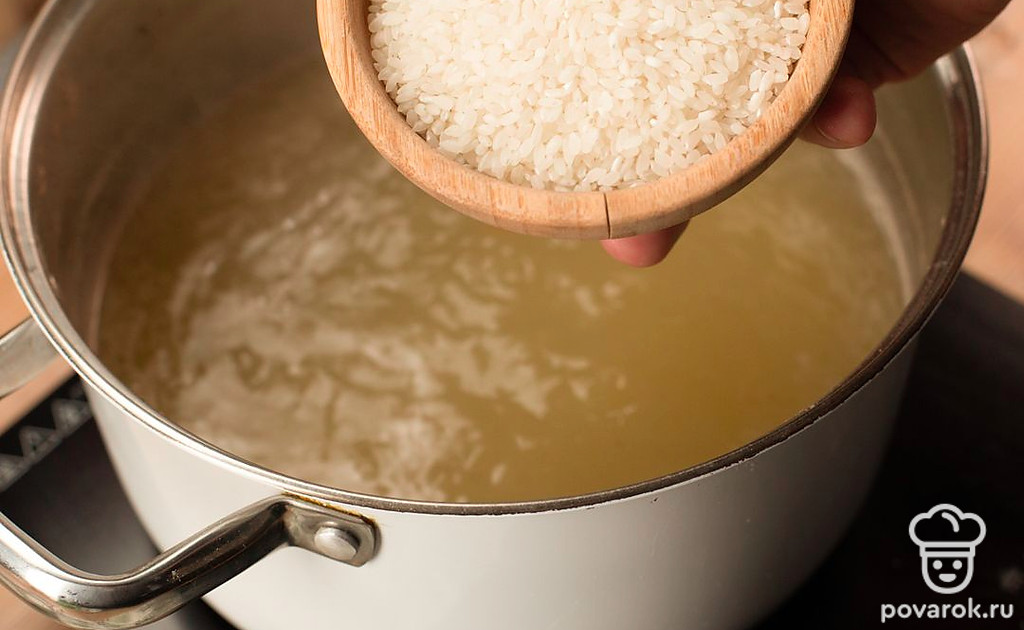 Готовое мясо нарежьте на небольшие кусочки. Процедите бульон и варите в нем рис в течение 10 минут.
