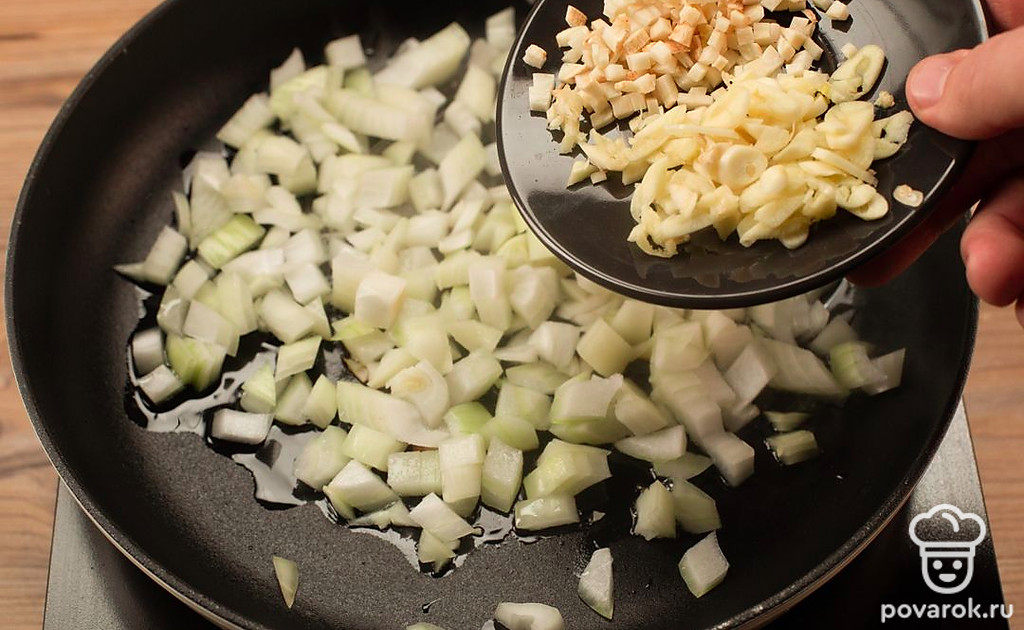 На разогретой с растительном маслом сковороде обжарьте измельченные лук, чеснок и корень петрушки. Готовьте примерно 7 минут до золотистого цвета.