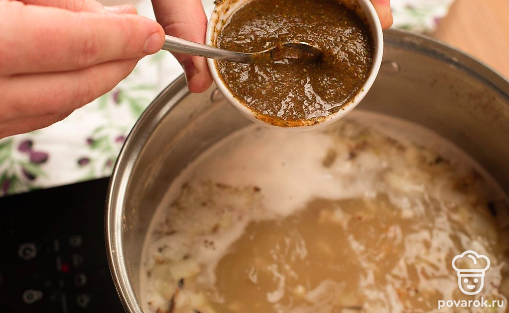 Выложите в бульон содержимое сковороды. Смешайте соус Ткемали, приправы и специи, отправьте к супу. Не забудьте лавровый лист. Варите 10 минут.