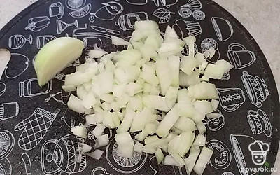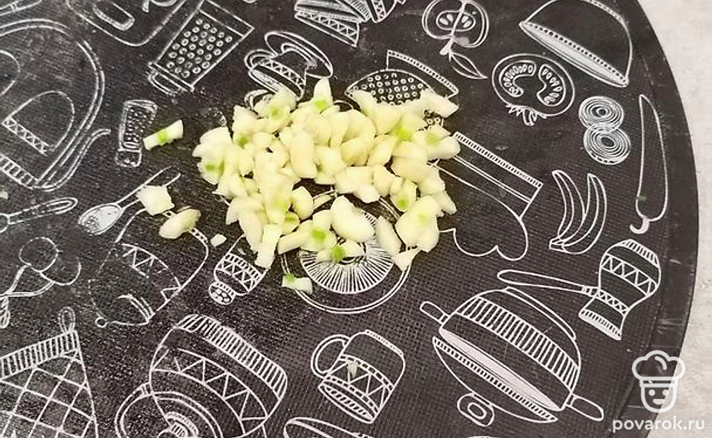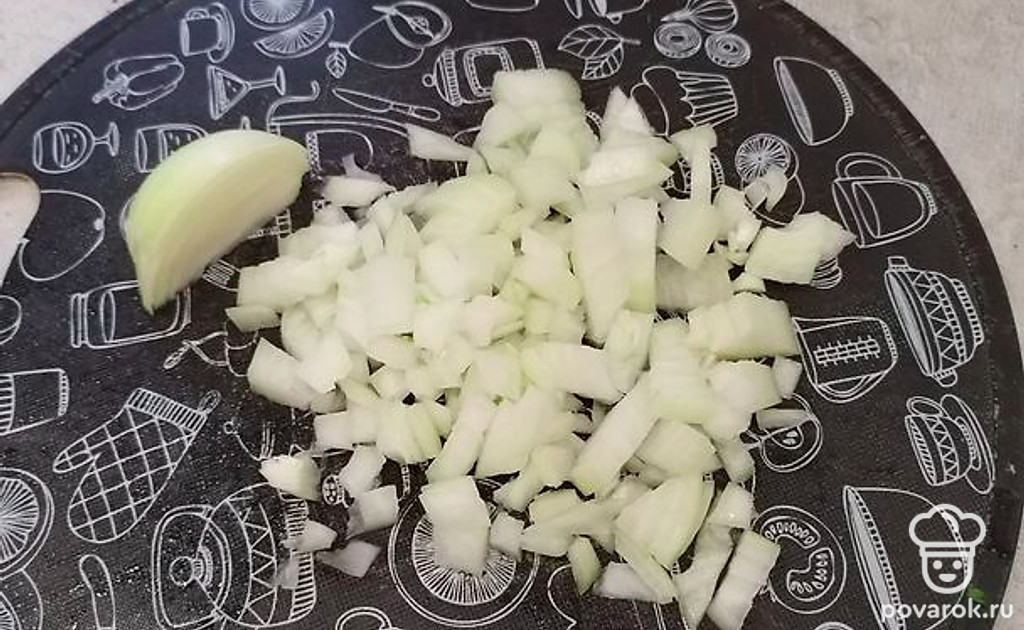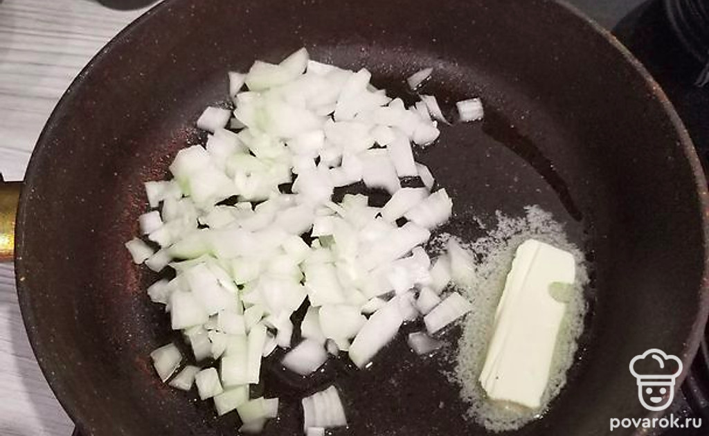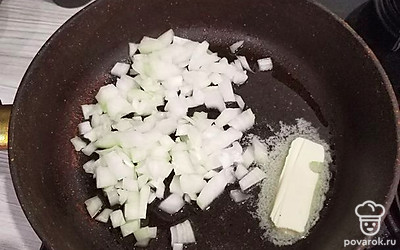 Разогрейте сковородку. Выложите кусочек сливочного масла. К нему отправьте лук с чесноком. Все перемешайте. Обжаривайте на среднем огне около 3 минут.