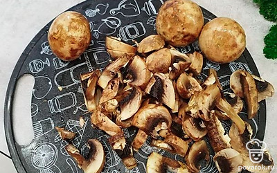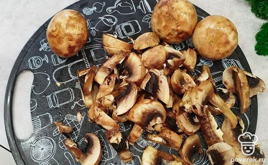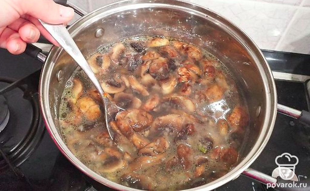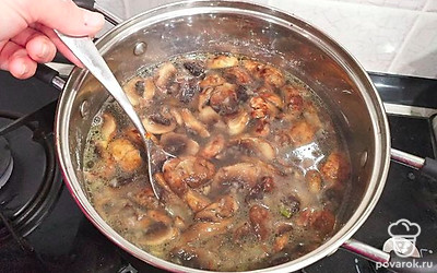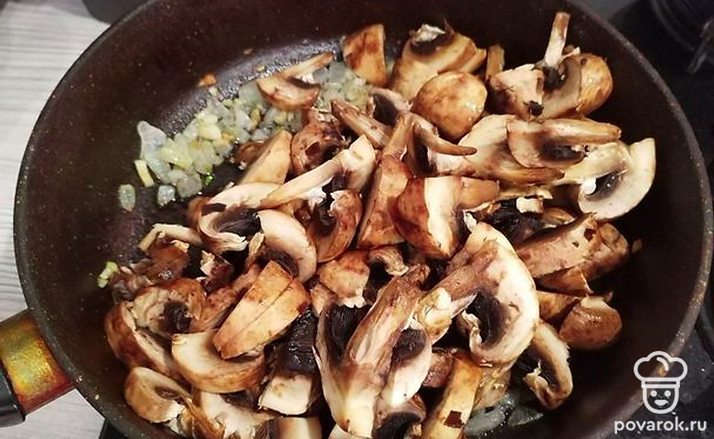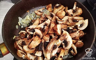 Отправьте грибы в сковородку к зажарке, перемешайте. Обжаривайте в течение 5 минут.