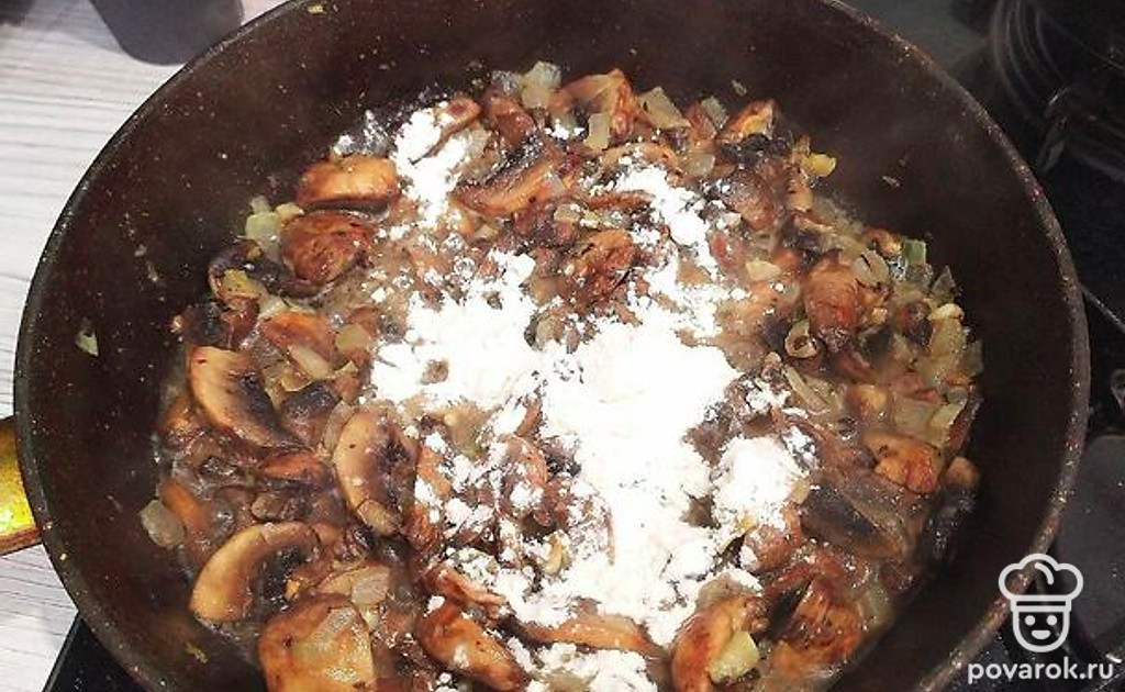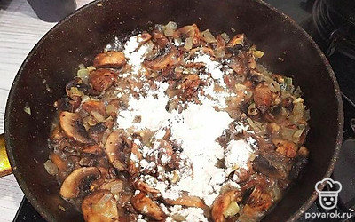 Добавьте муку, перемешайте. Обжаривайте около 2 минут.