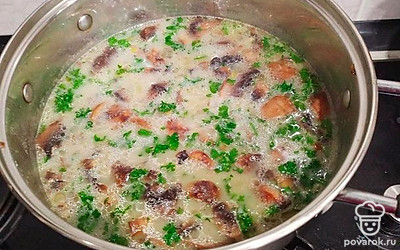 Зелень измельчите и добавьте в бульон. Варите на среднем огне еще 5 минут.