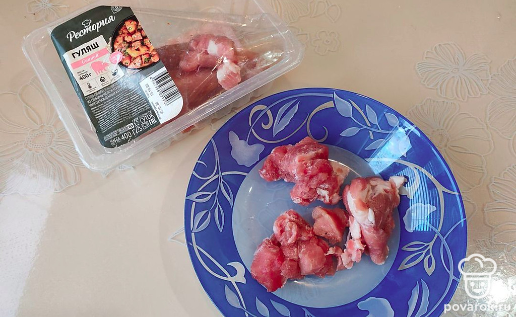 Свинину помойте, просушите и нарежьте на порционные куски 2 на 2 сантиметра. У меня охлажденный свиной гуляш (400 граммов).