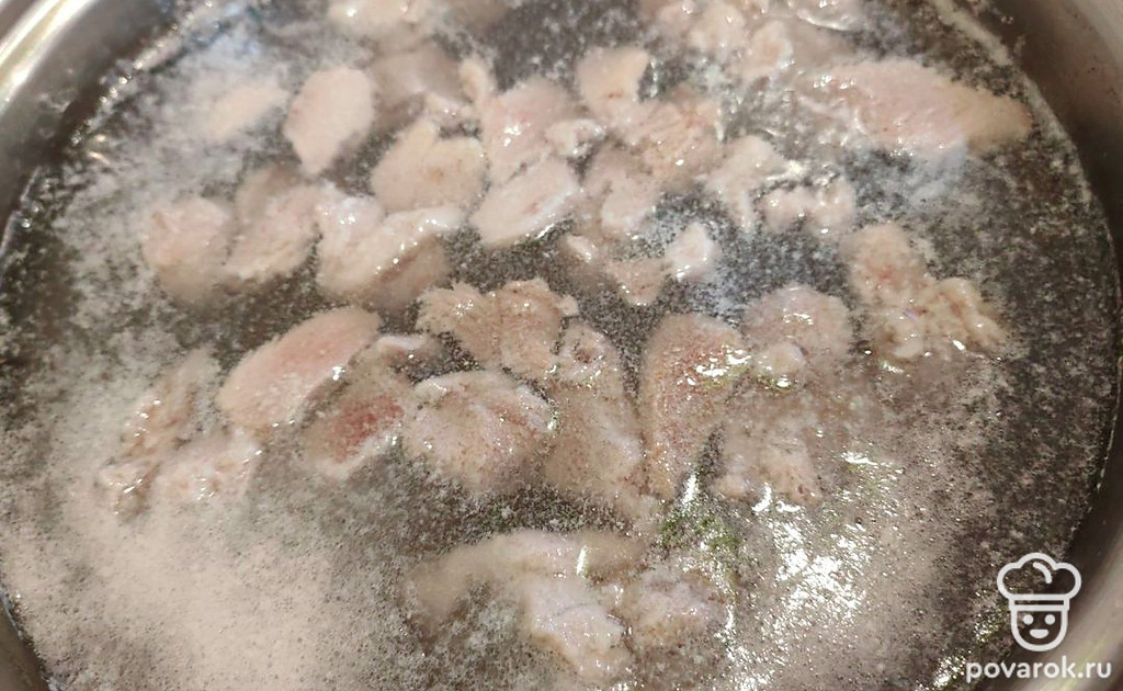 Отварите свинину в 2,5 литрах воды (40 минут). Когда закипит, снимите пену.