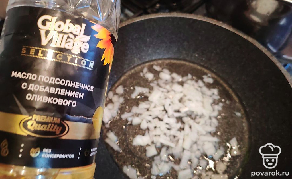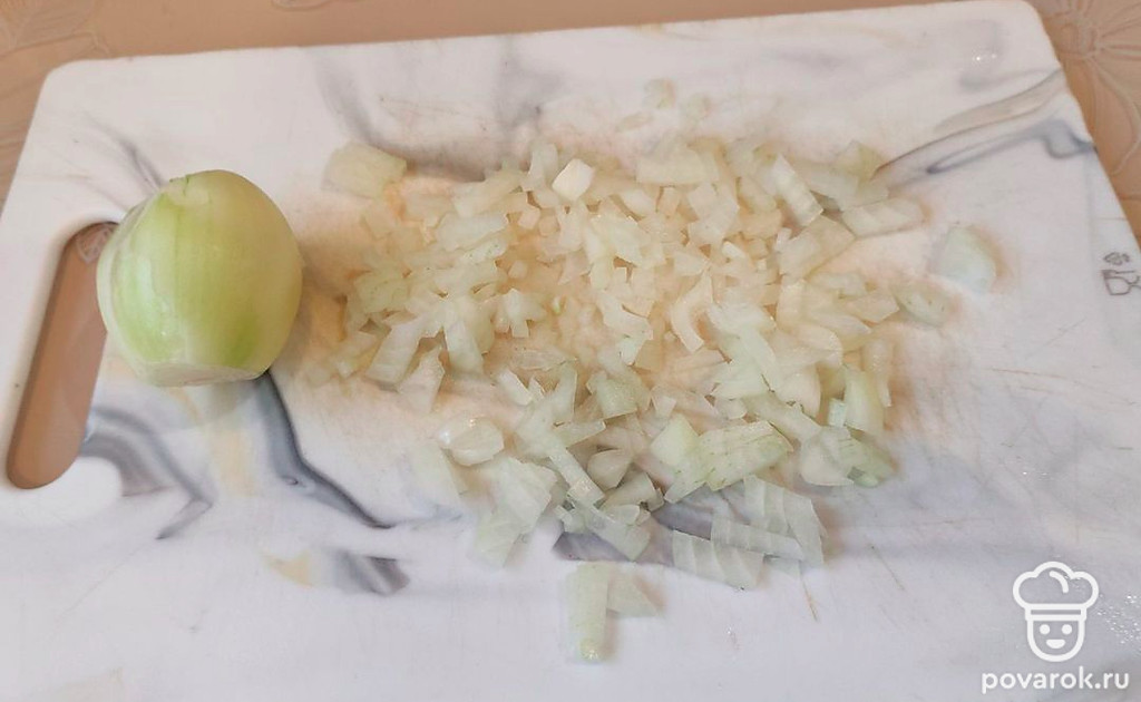 Пока варится бульон со свининой, приготовьте овощную зажарку. Лук нарежьте мелким кубиком.
