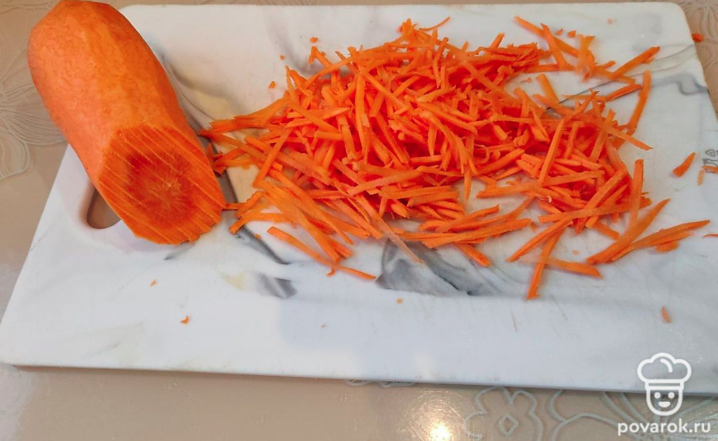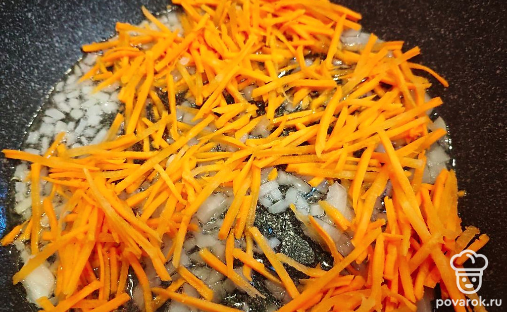 Отправьте морковь к луку, тушите 10 минут на медленном огне.