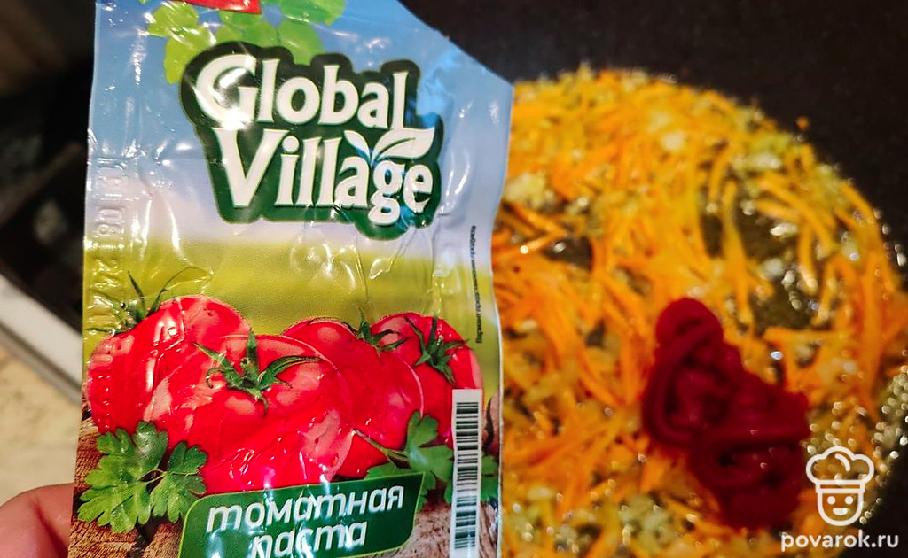 Добавьте 2 столовых ложки томатной пасты, перемешайте и выключите огонь.