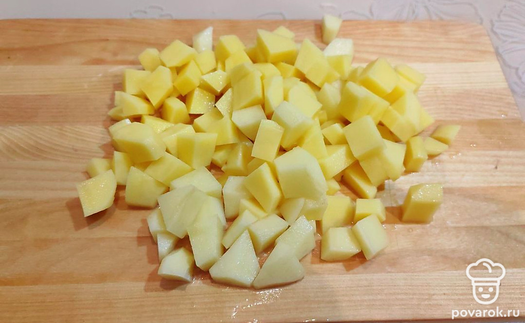 Картошку помойте, почистите и нарежьте средним кубиком.