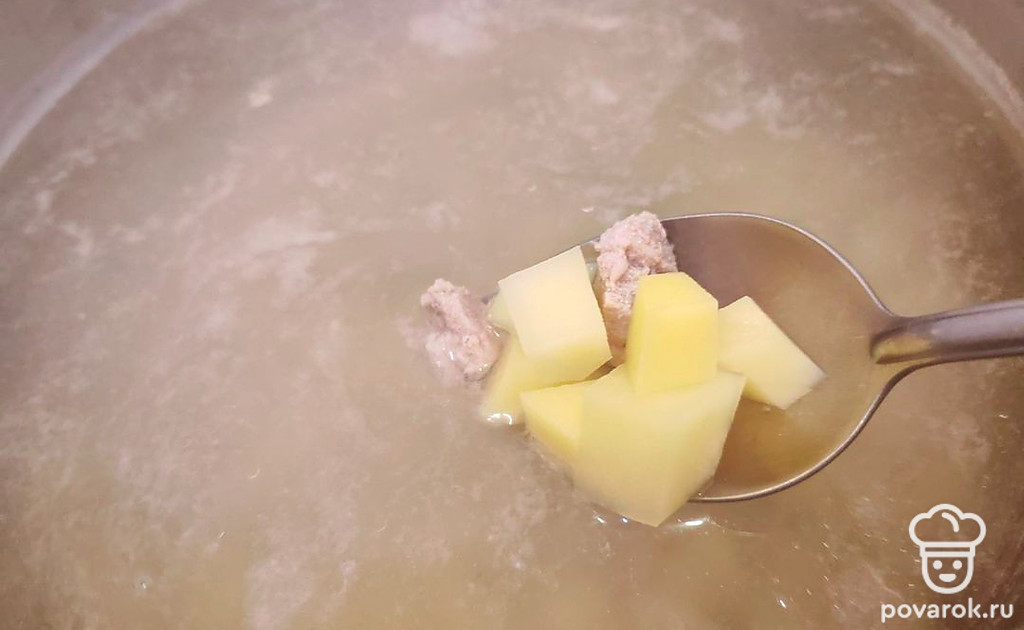 Добавьте картошку в мясной бульон. Варите 15 минут на среднем огне.