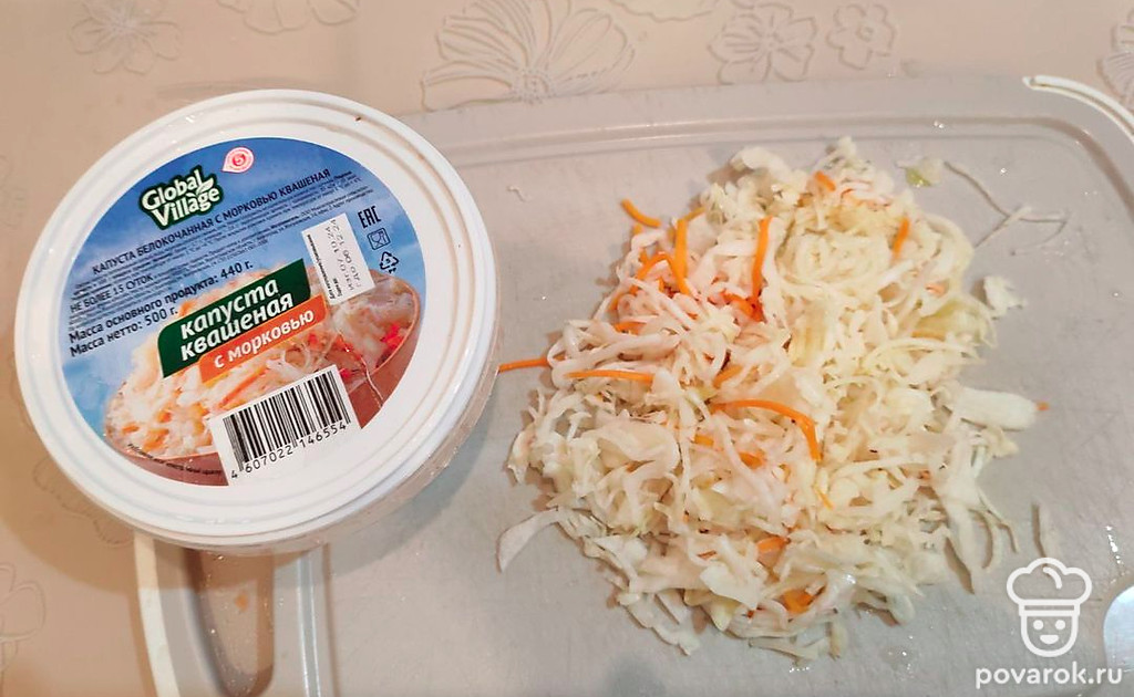 С квашеной капусты слейте жидкость. Если у вас очень кислая или очень соленая капуста, промойте ее под проточной водой.