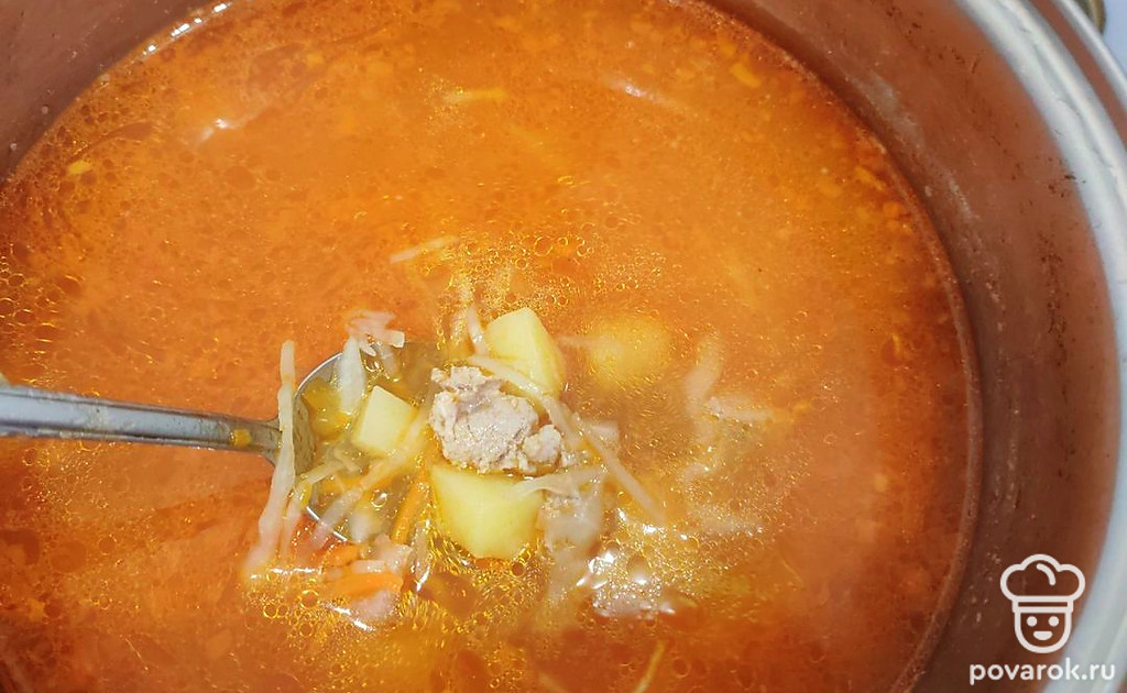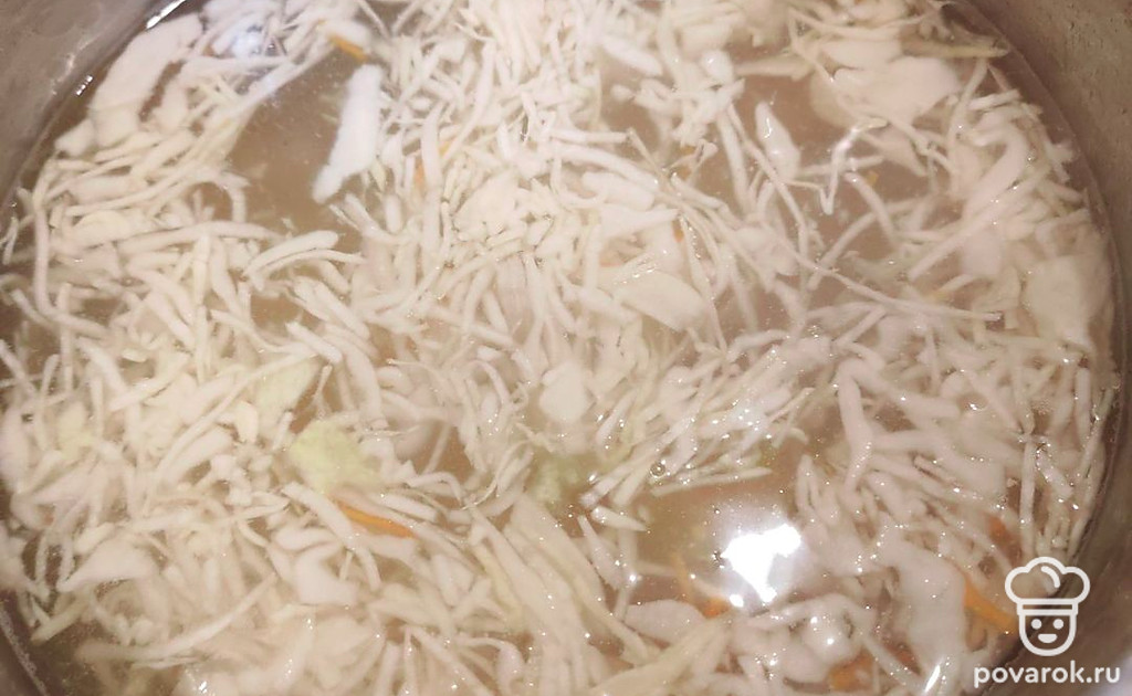 Добавьте овощную зажарку в кастрюлю с щами. Варите 5 минут.