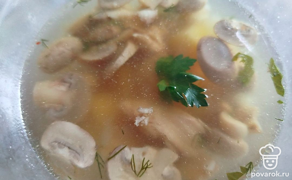 Ароматный грибной суп готов. Подавайте на обед. Приятного аппетита!