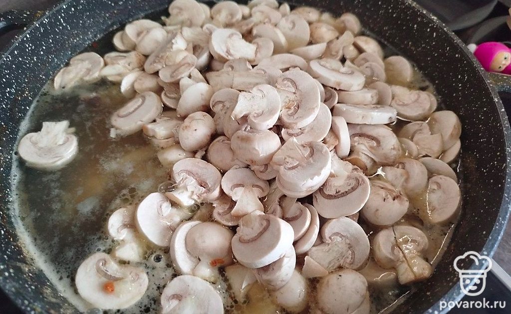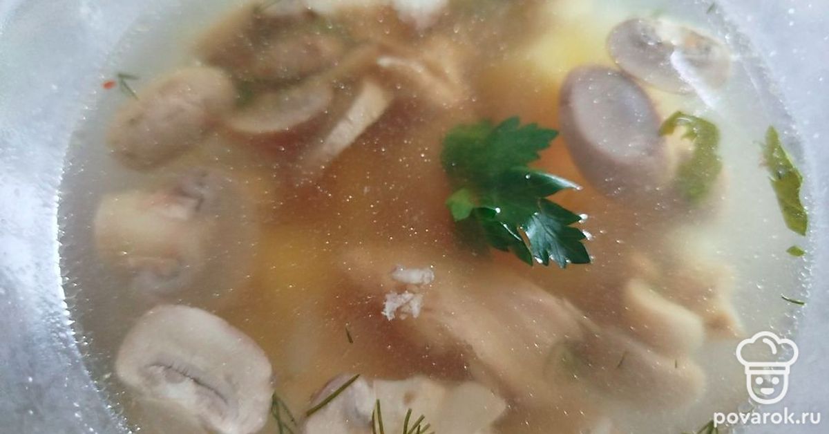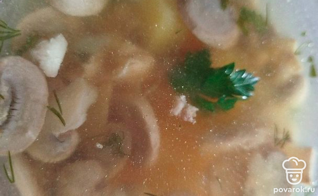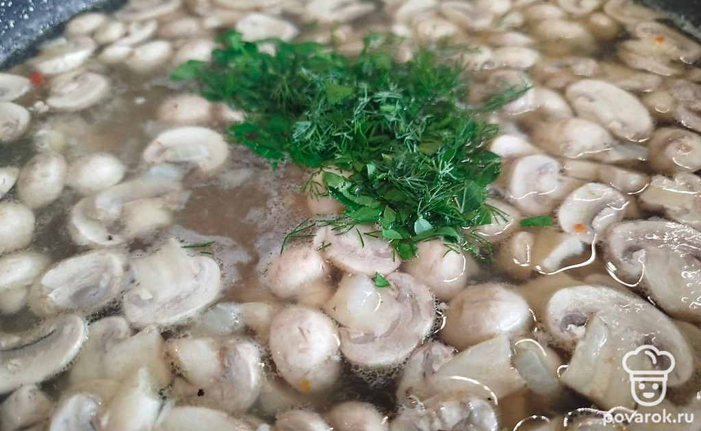 Когда шампиньоны сварятся, посолите суп по вкусу и добавьте зелень. Накройте крышкой. Убавьте огонь и томите минут 10.