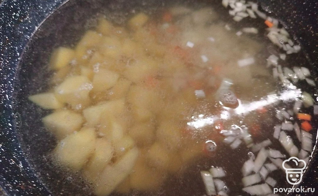 Добавьте картофель, морковь и лук. Варите до полуготовности овощей.