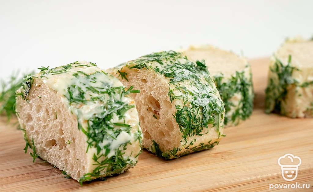Подготовьте багет. Отрежьте от багета четыре одинаковых ломтика. Срежьте корочку по кругу, оставляя только мякоть. Укроп мелко порубите. Края хлеба смажьте маслом и обваляйте их в укропе.