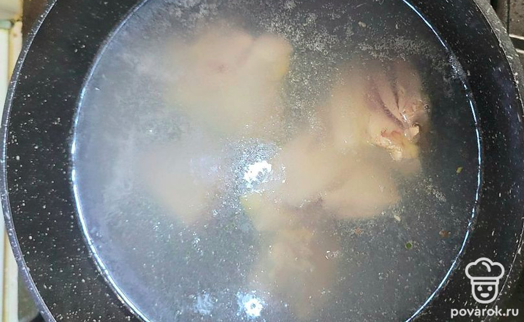 Куриный окорочок разрежьте на кусочки среднего размера, выложите в кастрюлю с кипящей водой. Снимите образовавшуюся пену, посолите. Варите 20 минут.