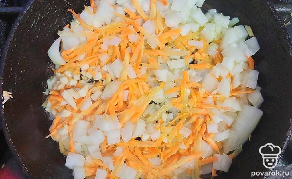 Морковь натрите на крупной терке, лук нарежьте небольшими кусочками, чеснок измельчите. Обжаривайте овощи на сковороде с небольшим количеством растительного масла в течение 5 минут.