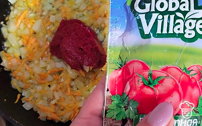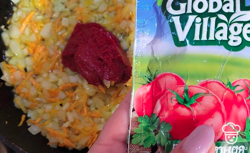 Добавьте в сковороду к овощам томатную пасту, специи и воду. Тушите еще 5 минут.