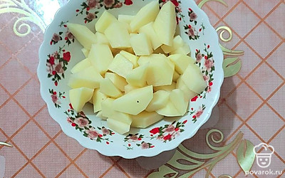 Картошку почистите, нарежьте небольшими кубиками, выложите в кастрюлю.