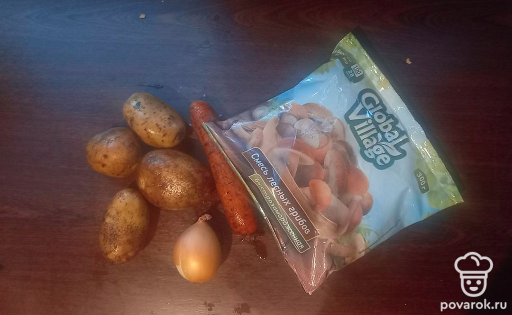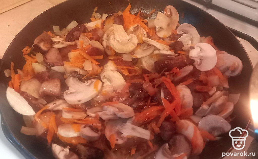 Обжарьте лук с морковью, добавьте грибы. Обжаривайте все вместе 15 минут.