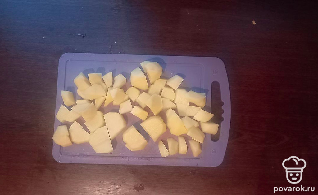 Почистите и нарежьте картофель. Отправьте вариться в кастрюлю с водой.