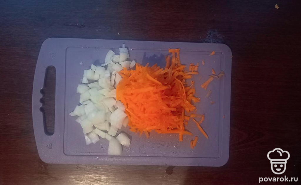 Нарежьте лук кубиком, натрите морковь на крупной терке.