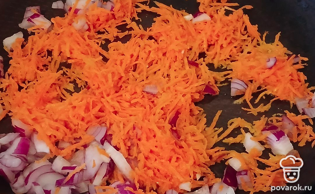 Натрите морковь на мелкой терке, нарежьте лук мелкими кусочками. Жарьте овощи 5 минут на растительном масле.