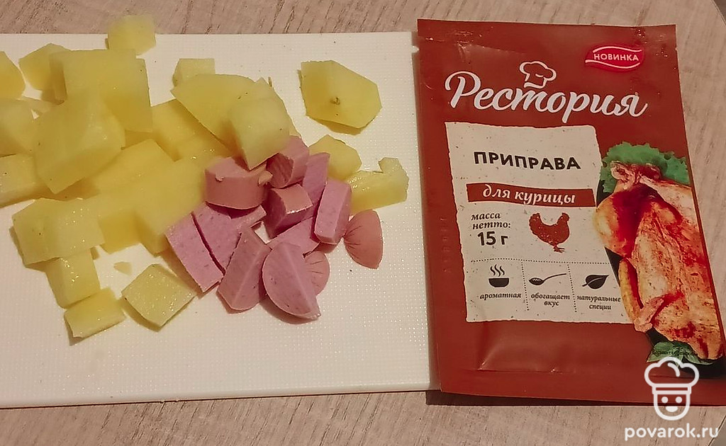 Нарежьте картофель небольшим кубиком, сосиски —полукольцами.