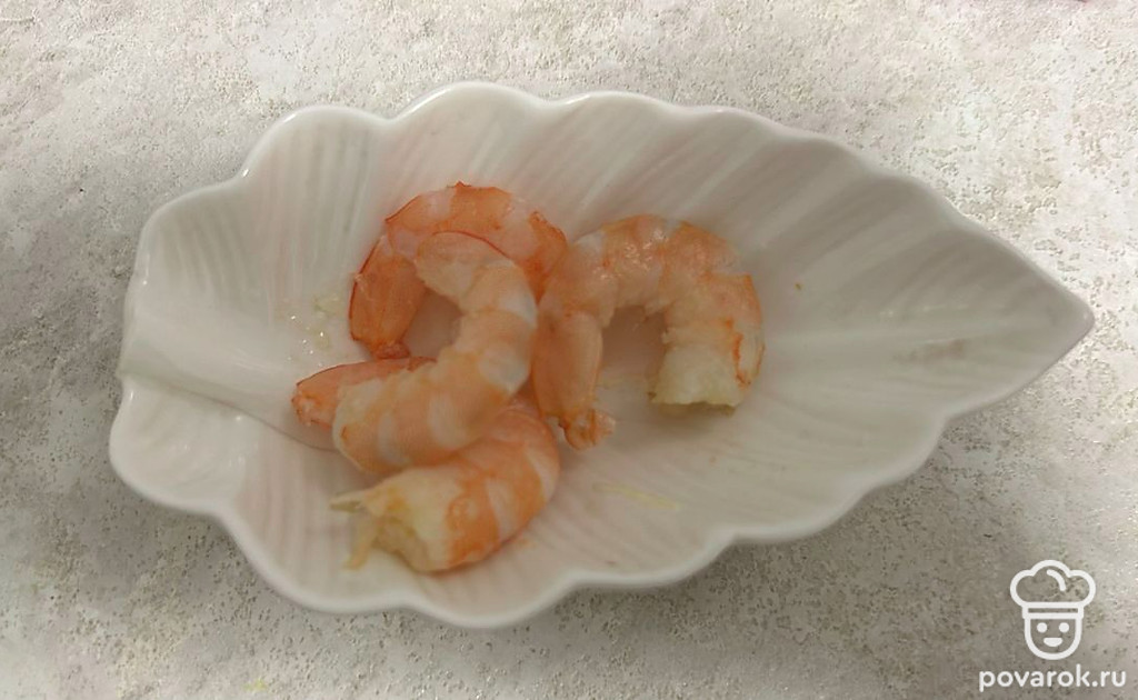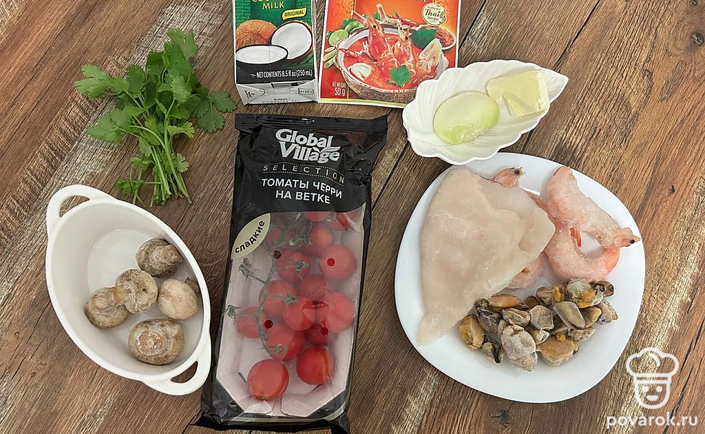 Добавьте мидии, креветки и нарезанный кольцами кальмар. Варите в течение 2 минут после закипания.